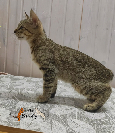Стандартные лапы. Хвостик короткий. Пятнистого окраса. Полудлинношерстная. Кисточки на ушах очень длинные.